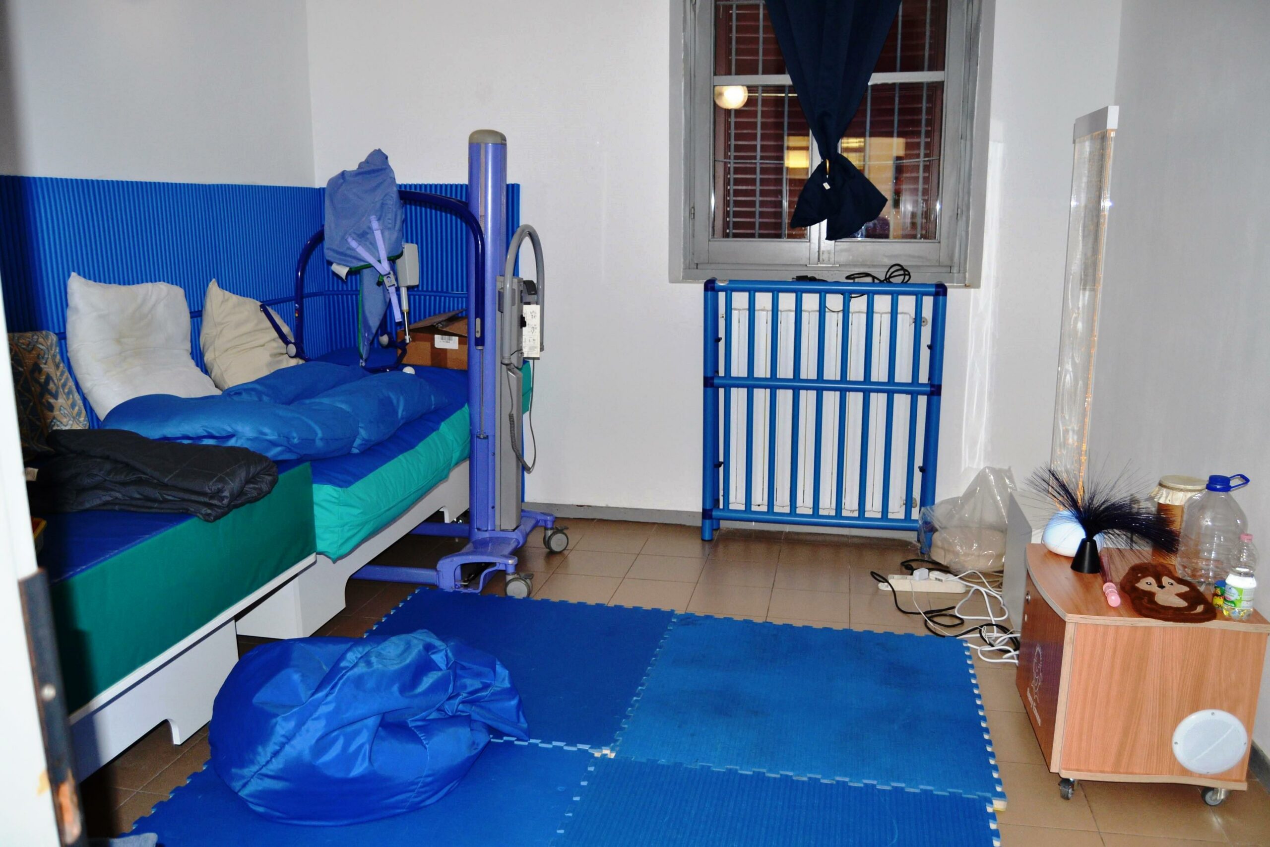 La stanza nasce per rispondere ai bisogni delle persone con disabilità grave che frequentano il centro e necessitano di momenti di decompressione emotiva, di cambi posturali assistiti o di esperienze sensoriali che possano compensare limiti funzionali nell’area percettiva. Per questo motivo l’ambiente è stato collocato in una zona tranquilla, lontana dai punti di maggiore passaggio, così da favorire un clima di calma e concentrazione.